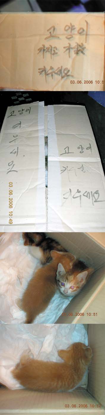 1. 어떤 ㅅㅂㄹㅁ가 길거리에 박스에 담아 2달도 안된 괭이 버림. 4마리씩이나.