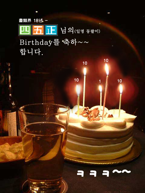 10+10+10+1+10=ㅋㅋㅋ 추카만땅요^^ 산뜻한 생일날 되시길.. 노래한곡 불러드릴께요 음음 아아~ <--- 발성연습중 오늘은 정말 기쁜나알~~~ 사랑하는 그대의 생일 우리모두 함께 모여 추카드려요~ 당신의 부모님께도 감사드려요~ 둥글게 모여 이쁜 케익위에 촛불을 밝히고- ^^*