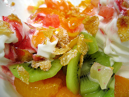요구르트 얼린거에 딸기시럽+각종과일을 잘게 잘라서 뿌린...