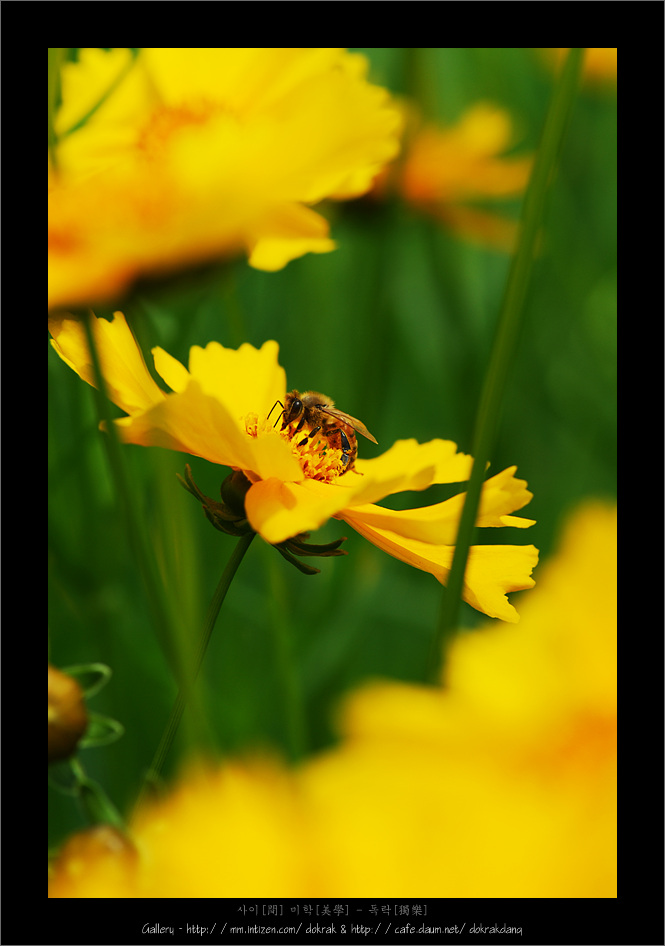 달리는 차를 멈추어 금빛 반짝이는 금계국 가득한 꽃밭에서 휴식을 취했습니다.