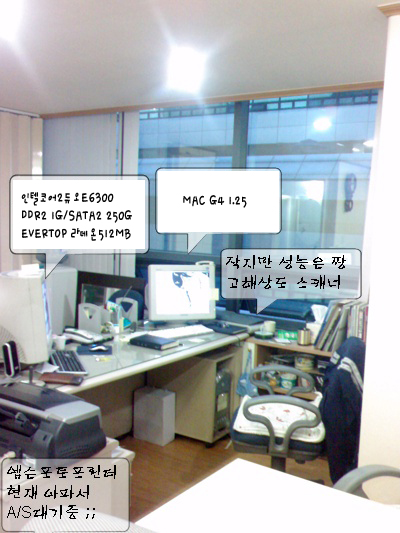 저희 사무실엔 맥만 3대...하지만 G5만 하나 켜서 작업한다는거... 프린터는 레이져...잉크젯...대게 레이져만 켠다는거...^^