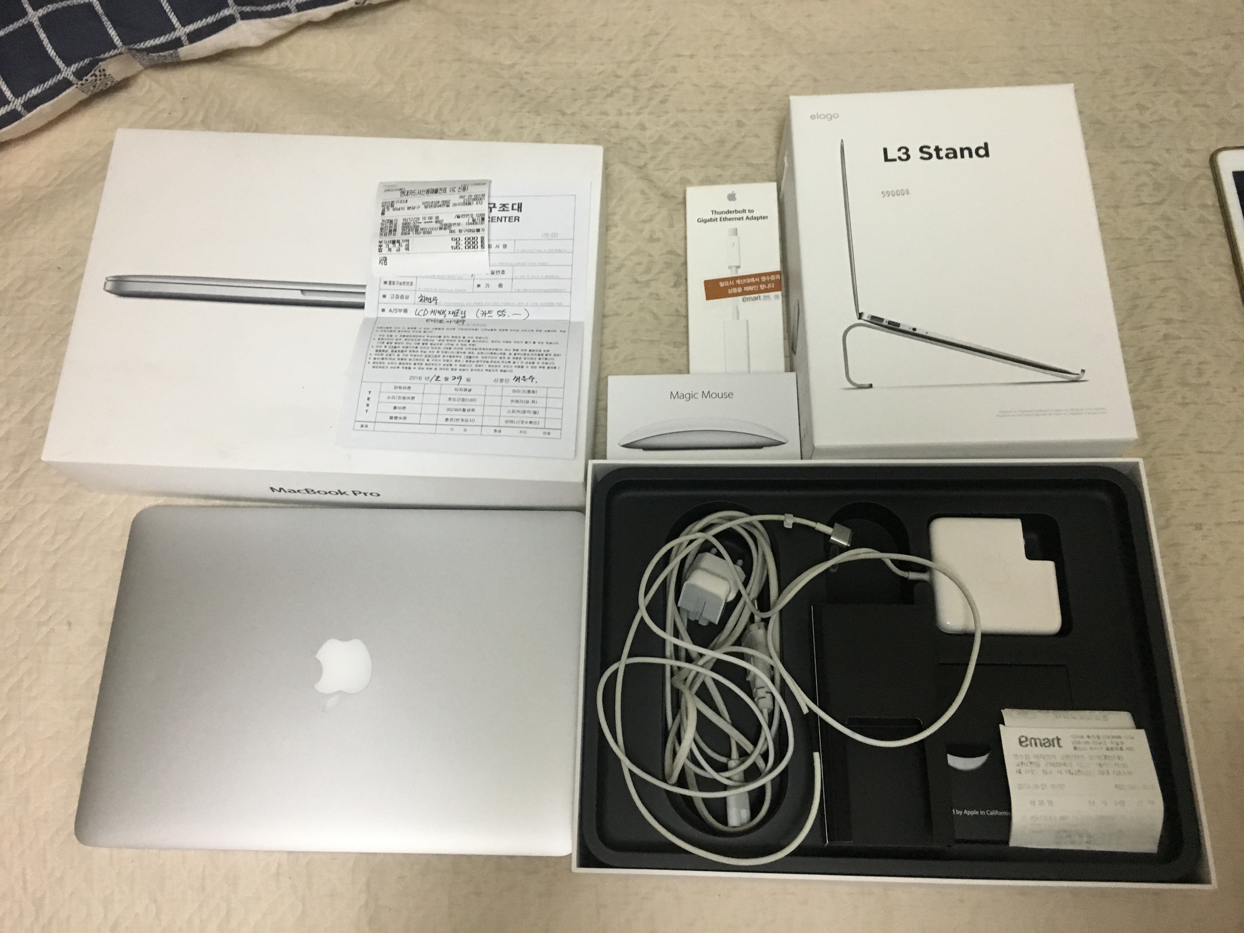 악세사리로는 1. 썬더볼트 이더넷케이블, 2. 맥북거치대, 3. 매직마우스2 입니다.