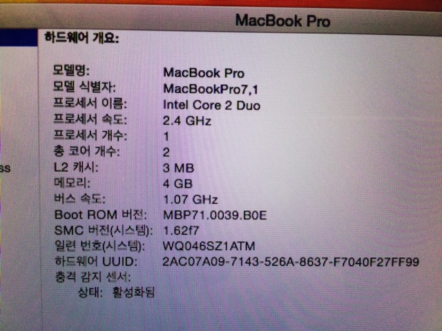 맥북프로 13인치 2010 Mid 250GB 4G 메모리 팝니다