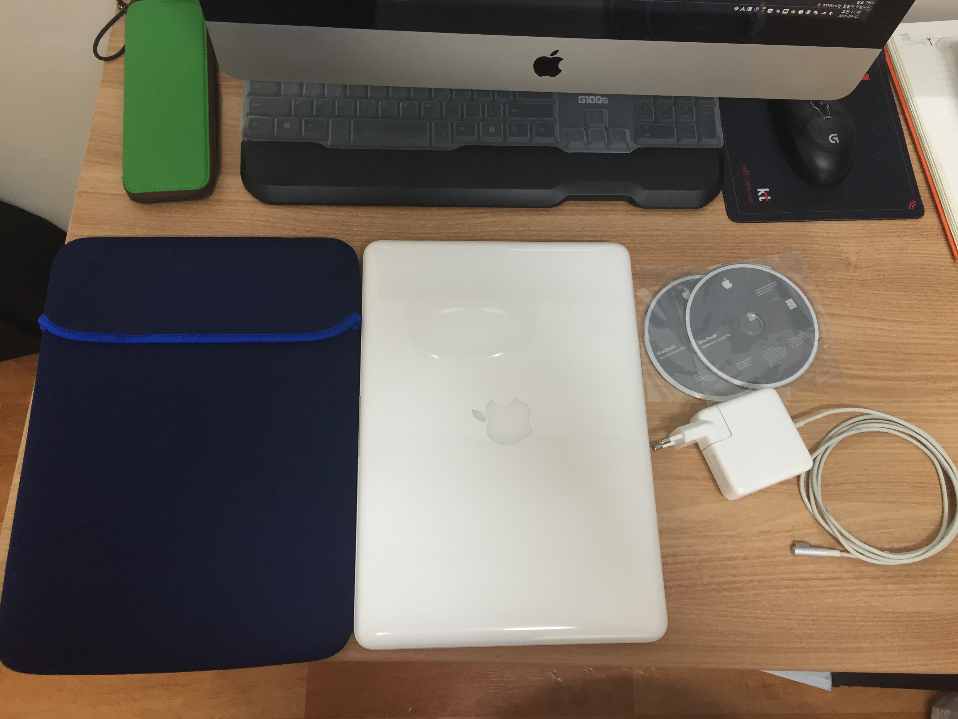 구성품으론 맥북, 파우치, 충전기 그리고 살 때 같이 준 씨디 두장입니다.