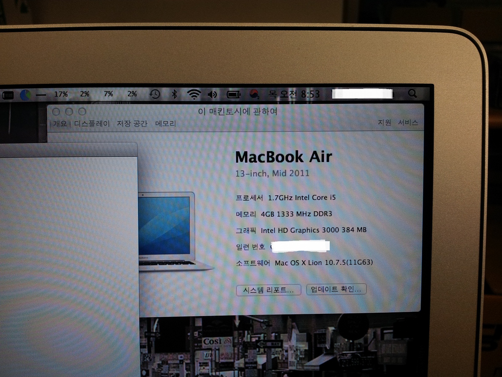 사양: Memory 4GB, SSD 256G, Mac OS X Lion 10.7.5