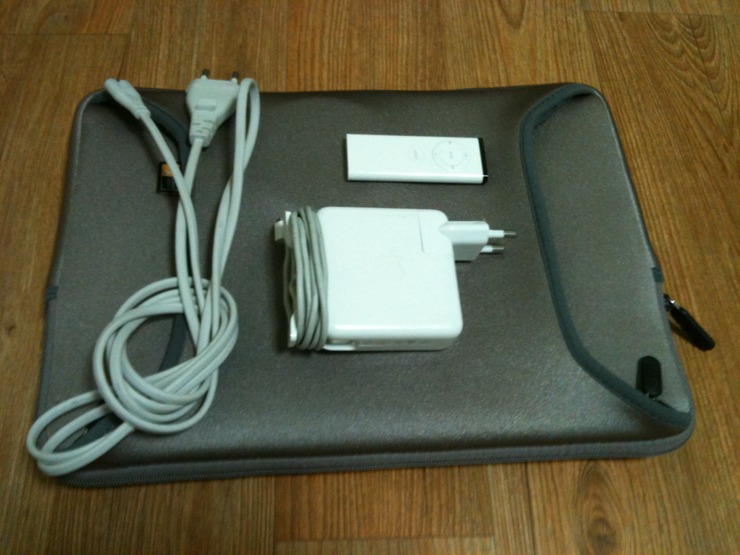 구성품은 사진과 같이 리모컨, 아답터 확장선, 아답터, 파우치,맥북 입니다.