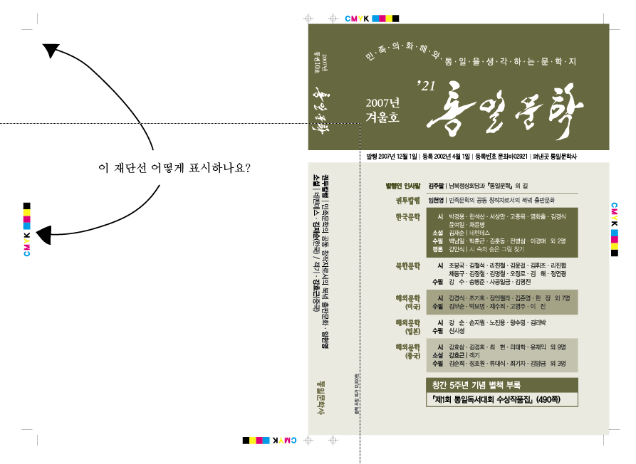 emoticon_096 CMYK 컬러부분은 일러스트에서 그려서 해당위치에 놓아주어야 합니다. 재단선은 일러스트기능주에 CropMark 선택이 있습니다. 재단선을 줄 대상을 선택후..이 CropMark 를 선택하면 자동으로 재단선표시가 됩니다. ========= ★준도우미 A/S의 [자기 소개]를 마우스로 눌러보세요.