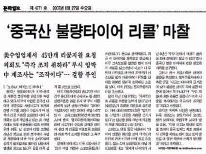 중국산 불량타이어가 미국-중국간 새로운 통산마찰 요인으로 부상하고 있다.미국에 수입된 중국산 타이어 결함으로 차량사고가 발생해 인명 사고를 내면서 수입사가 미 당국에 리콜 지원을 요청한데 이어 미 의회도 본격 개입하고 있는 것. 이번 사태는 특히 애완동물사료와 치약의 유해 파동, 납 성분이 다량 포함된 장난감 등으로 인해 중국에서 수입된 제품들에 대한 미국 소비자들의 신뢰가 떨어질대로 떨어진 상황에서 발생한 것으로 불신의 골을 더욱 깊게 할 것으로 보인다.