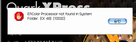 해당 내용때문에 다운이 되지 않습니다. 해당 내용이 안뜨게 하시려면 쿽3.3 폴더안에 익스텐션안에 한맥필터와 Eficolor....휴지통에 버리시면 됩니다. 없어도 상관 없는겁니다. 쿽이 자주 따운되는 아래 내용을 참고하세요. 1.666바이러스 문제 666바이러스 체크는 agax 1.3으로 하시면 되는데 대도록 시디나 외장으로 부팅을 해서 해주시는것이 완벽하게 치료하는 방법입니다. http://www.tomatomac.com/?doc=bbs/gnuboard.php&bo_table=mac_souce_program&sselect=wr_subject%7Cwr_content&stext=agax&soperator=0&page=1&wr_id=94 사용방법은 아래 링크 http://kmug.co.kr/board/zboard.php?id=system&no=386&ln=&ls=on&lc=on&lcc=&keyword=agax 2.쿽프로그램에 사용메모리를 너무 작게 셋팅을 하고 작업을 할때 쿽에 사용메모리는 최소 100MB정도는 해주셔야 됩니다. 그래서 내장메모리가 최소 768MB~1GB이상은 되어야 됩니다. 3.자형폴더에 서체가 너무 많은경우 압니다. ================== 베스트맥(아이디)를 클릭하고 [자기소개]를 참고하세요.