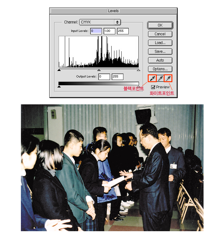 원본사진을 보시면서 블랙으로 인쇄되야할부분 (예를들면 상받는 학생옷..등)을 클릭하시면
