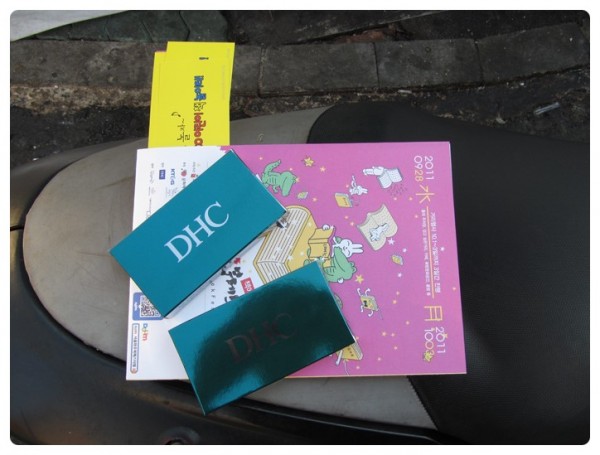 구경중 선물로 받은 책자와 일회용 DHC 클렌징, 세안, 보습용 세트이다. 2개나 줬다.