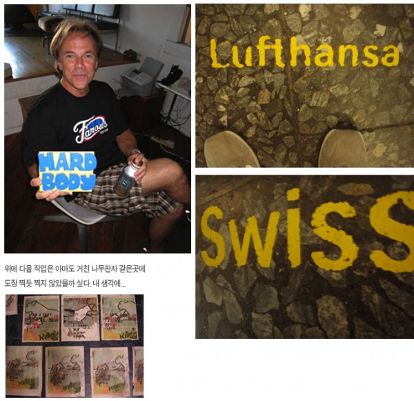 예전 타이포그래픽 디자인서적에서 그가 작업하는 사진이 실린적이 있었는데... 길바닥에 글을 쓰고 뭔가 스크레치를 내는 모습도 있었고 또 글을 잉크젯 프린터로 출력을 한다음 거기에 물을 뿌리고 있는 모습도 있었다.