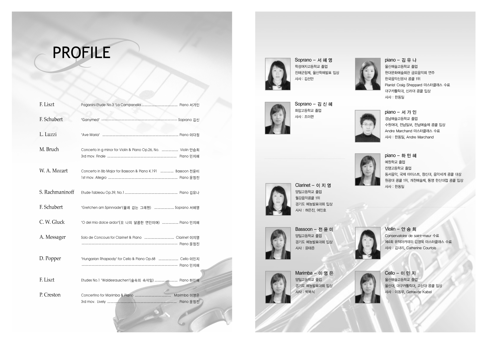 인물 사진 뒤에는 그림자를 살짝 깔아주시고, 파트별 인물 구분 사이에는 바이올린이나 첼로 등의 악기를