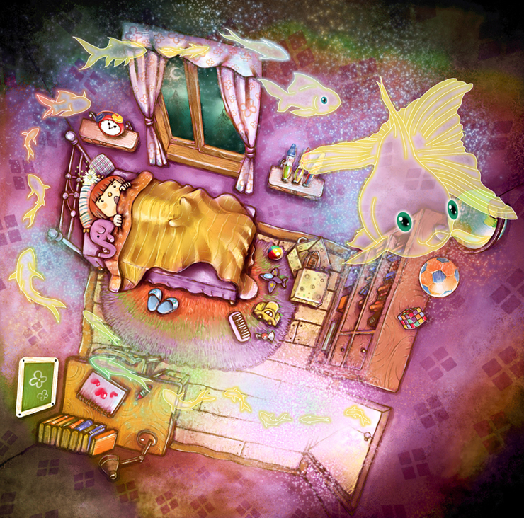 하늘바다로 인도하려는 물고기떼가 방문으로 들어오는 장면인데요.