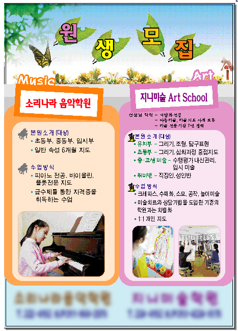 수고하셨네여 ^^ 한가지 말씀드리자면.. 위의 원생모집..의 잎파리.... 왜 찢어진걸로 ^^;;;;; 기왕이면 밝고 싱싱한것으로 넣어주면 더 좋을꺼 같아욤 *^^*