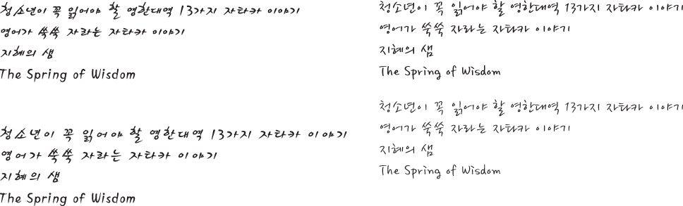 세종소주체, 봄날체로 좀 부탁드려용~~ Voyager 일반 0 4249 2009.01.19 19:00 -0001.11.30 00:00 vo.ai (0byte) + 31 > > 청소년이 꼭 읽어야 할 영한대역 13가지 자타카 이야기 > 영어가 쑥쑥 자라는 자타카 이야기 > 지혜의 샘 > The Spring of Wisdom > > 부탁드려용~~ >