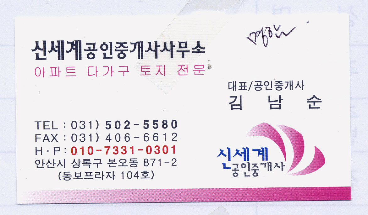 급히 글씨 부탁드립니다~ 조희진 일반 0 4409 2009.05.16 11:43 오늘 들어가야 하는 건데 글씨체가 없어서요~ 똑같이 해달라고 하셨는데~ 상호명하고 하단 상호명 부탁드립니다. 신세계공인중개사사무소 신세계공인중개사