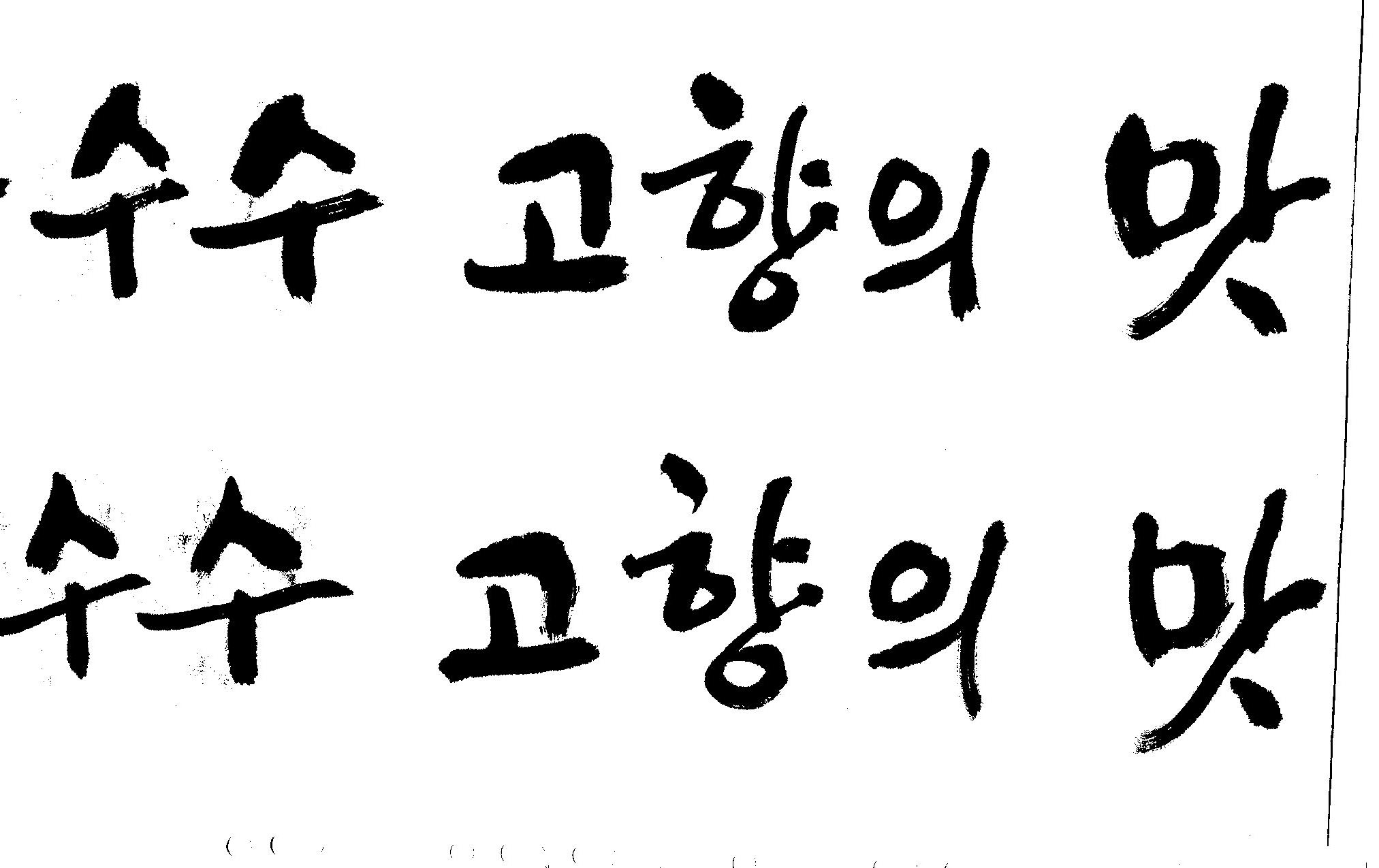 캘리고수님.. 캘리 부탁드립니다. 김철호 일반 1 13553 2008.10.31 15:45 > > > > > 강원도 > > 찰옥수수 > > 고향의 맛 > > > > 이상의 문구 입니다. > > 캘리 고수님들 시간되시면 도움 부탁드립니다.. > > > > 유용하게 쓰시길 , 스캔이 깨끗하지 못해서 수고 좀 하셔야 겠네요.. > "맛"이 라는 글자가 잘 않나와서 따로 올립니다. >