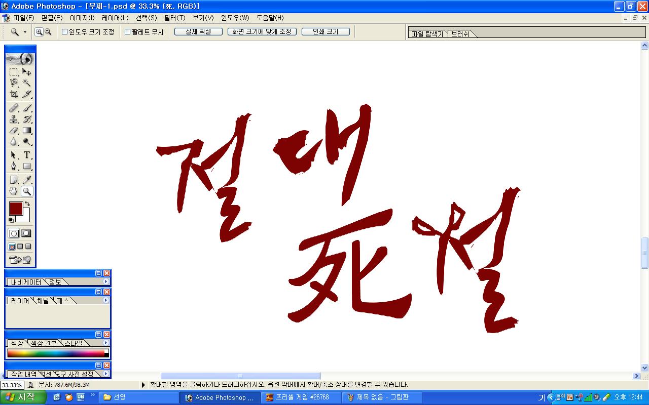 정중히 캘리 부탁드립니다. -_- 류재철 일반 0 6416 2009.11.16 11:18 실력자 분들이 많이 계셔서 이렇게 염치없게 부탁드립니다. - 절대死절 : 첨부한 파일 참고해주시면 감사하겠습니다.(약간 거친느낌? ^^;;) : '절'자의 ㅈ은 가위로...^^;; : 포스터 제작용이라 ai 파일이 필요합니다. 대학동아리 연극공연 포스터로 쓸 예정입니다. 비상업적인 공연이라 이렇게 부탁드립니다.